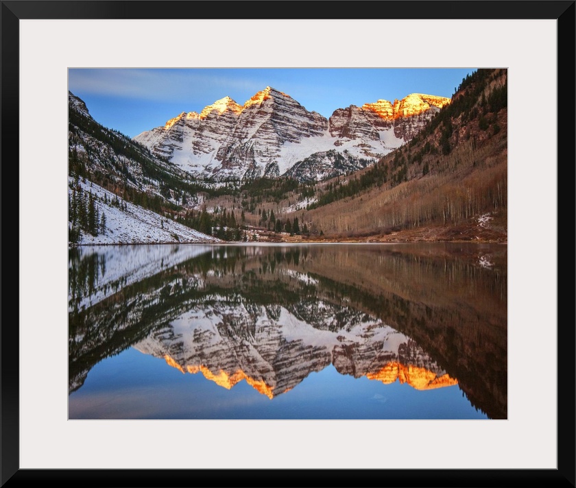 <p>Sunlight on the peaks of the Maroon Bells, reflected in the lake below.</p>