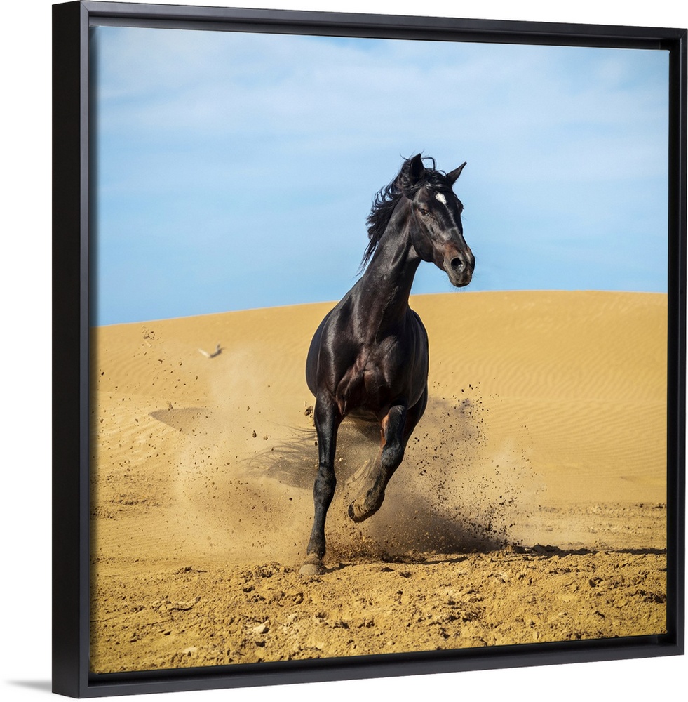 <p>Marrakesh-Safi (Marrakesh-Tensift-El Haouz) region, Essaouira, a black Barb horse runs over sand dunes.</p>