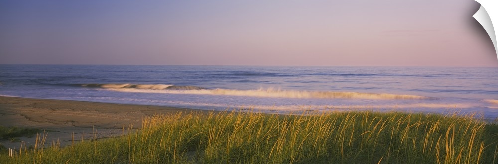 <p>Wide angle photograph of Marram grass on the beach at Parker River National Wildlife Refuge in Massachusetts. Waves can be seen crashing into the beach in the distance.</p>