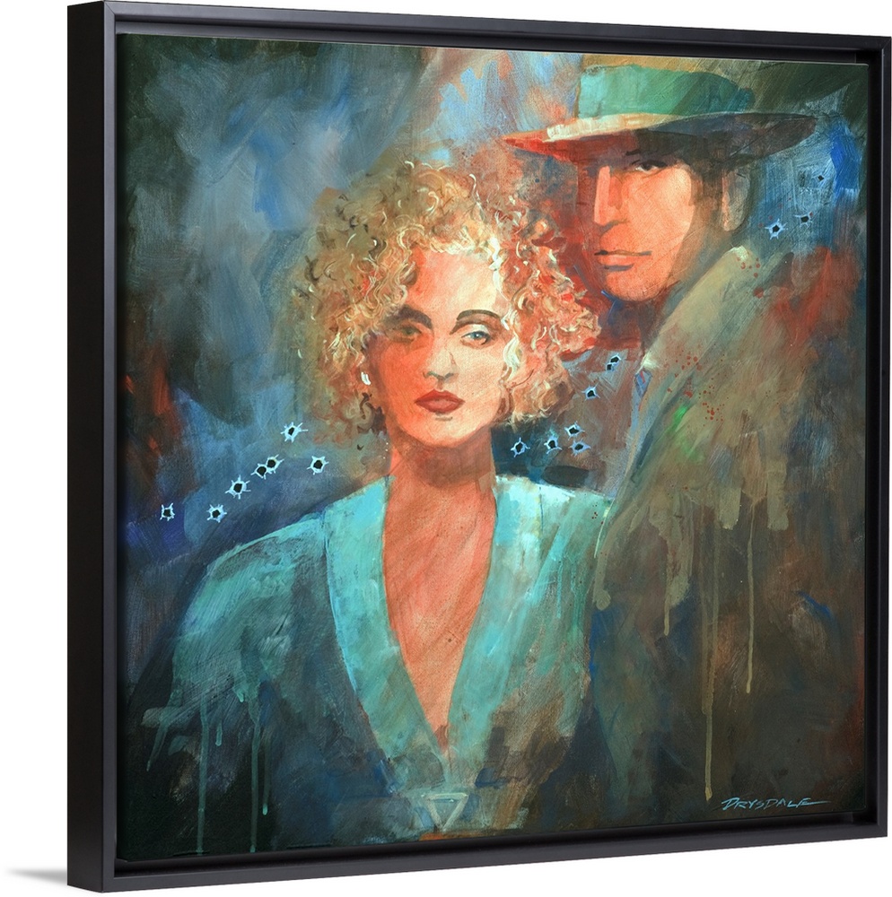 <p>Painted portrait of Bonnie and Clyde with bullet holes painted across the middle.</p>