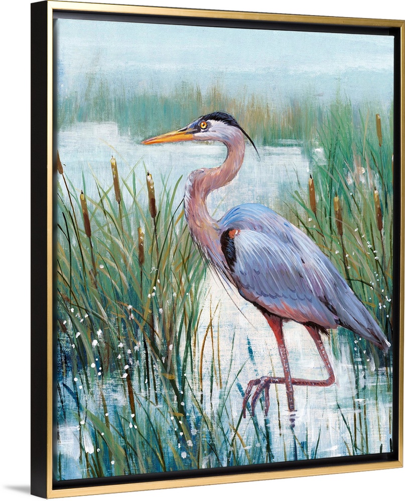 <p>In this contemporary artwork, a stoic heron wades in the water with tall grasses and cattails working as camouflage.</p>