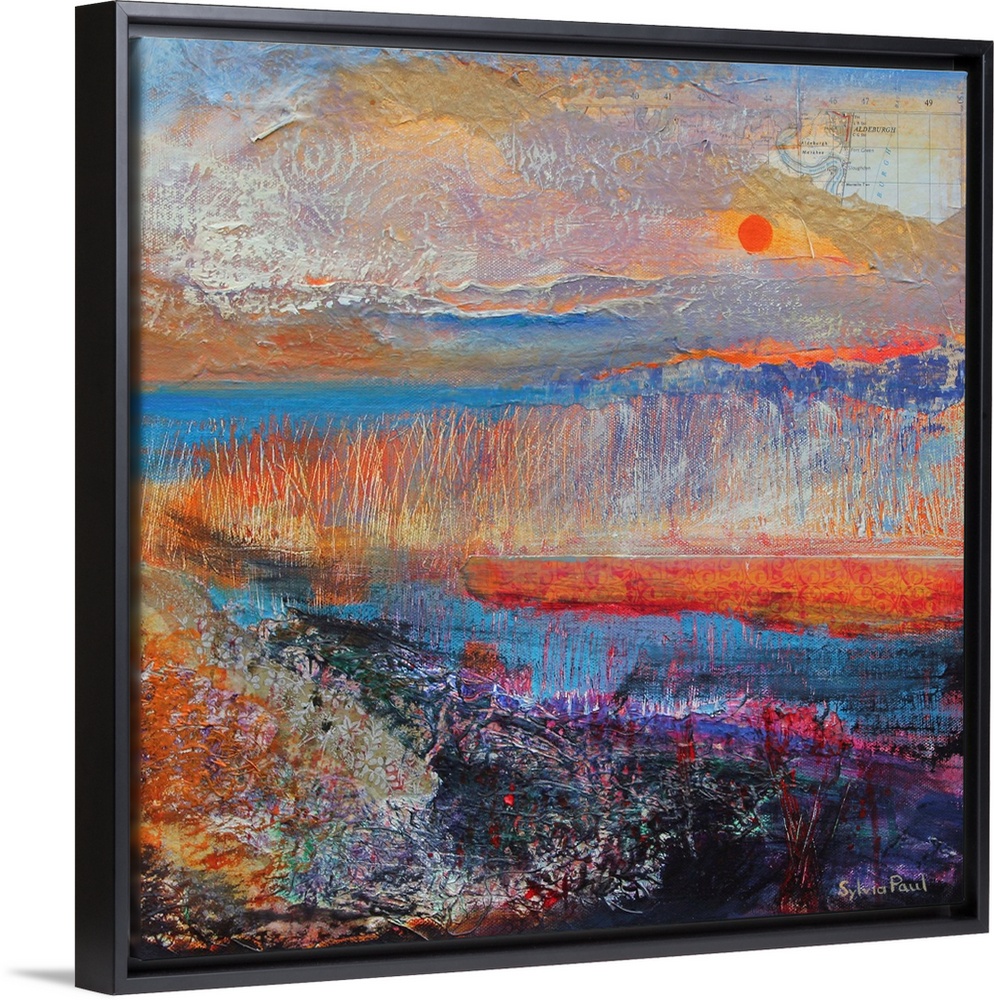 <p>Contemporary painting of an idyllic landscape at sunset.</p>