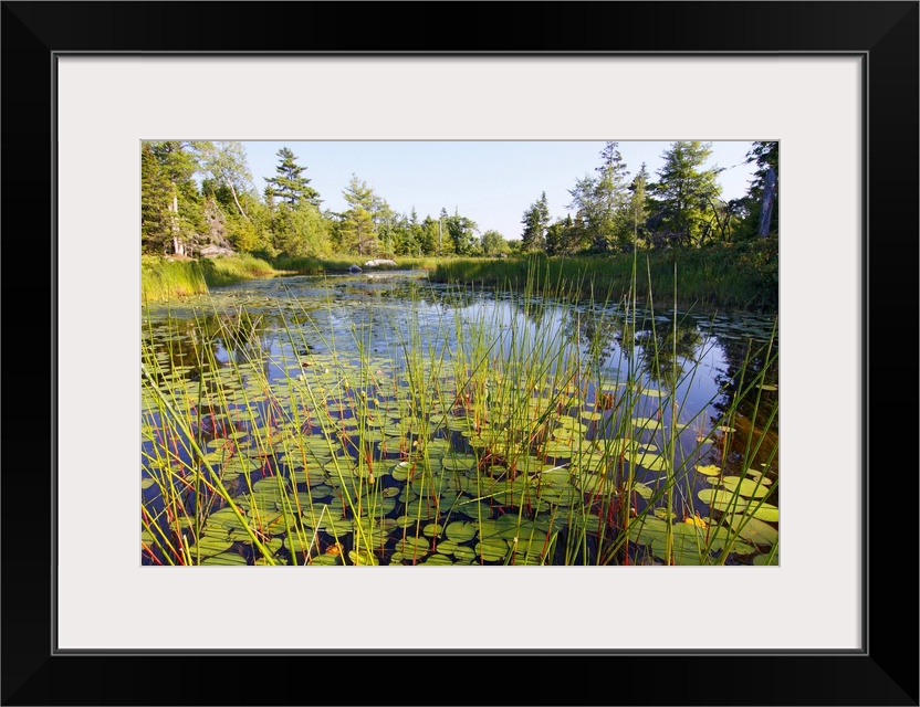 <p>Marsh with reeds and lily pads surrounding a pond, West Stoney Lake, Nova Scotia, Canada</p>