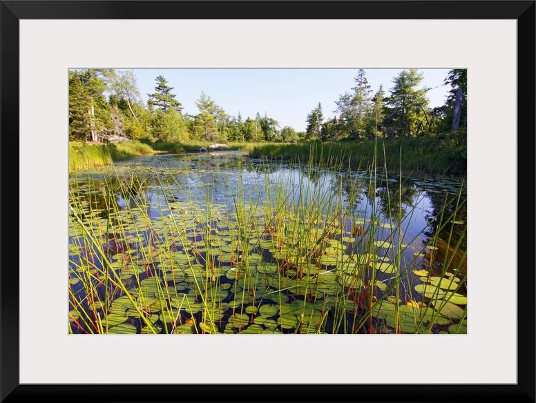 <p>Marsh with reeds and lily pads surrounding a pond, West Stoney Lake, Nova Scotia, Canada</p>