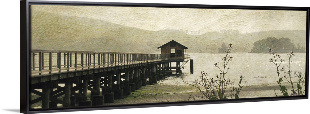 <p>Wide angle, fine art photograph of a pier extending into the water, a small hut at the end. An overcast day, with swirling textures in the sky.</p>