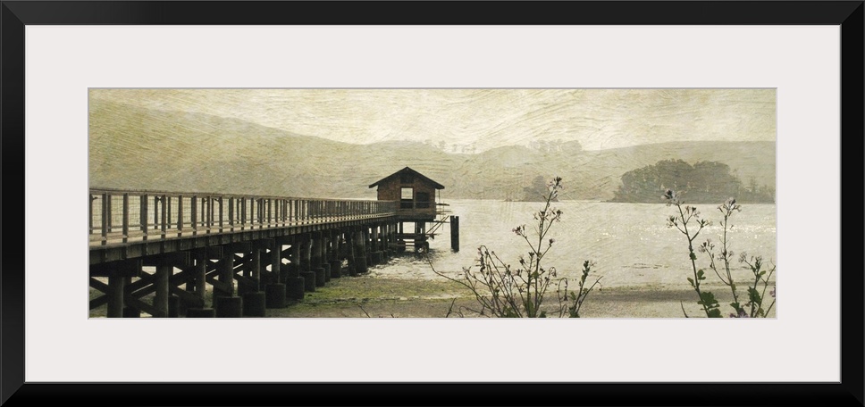 <p>Wide angle, fine art photograph of a pier extending into the water, a small hut at the end. An overcast day, with swirling textures in the sky.</p>
