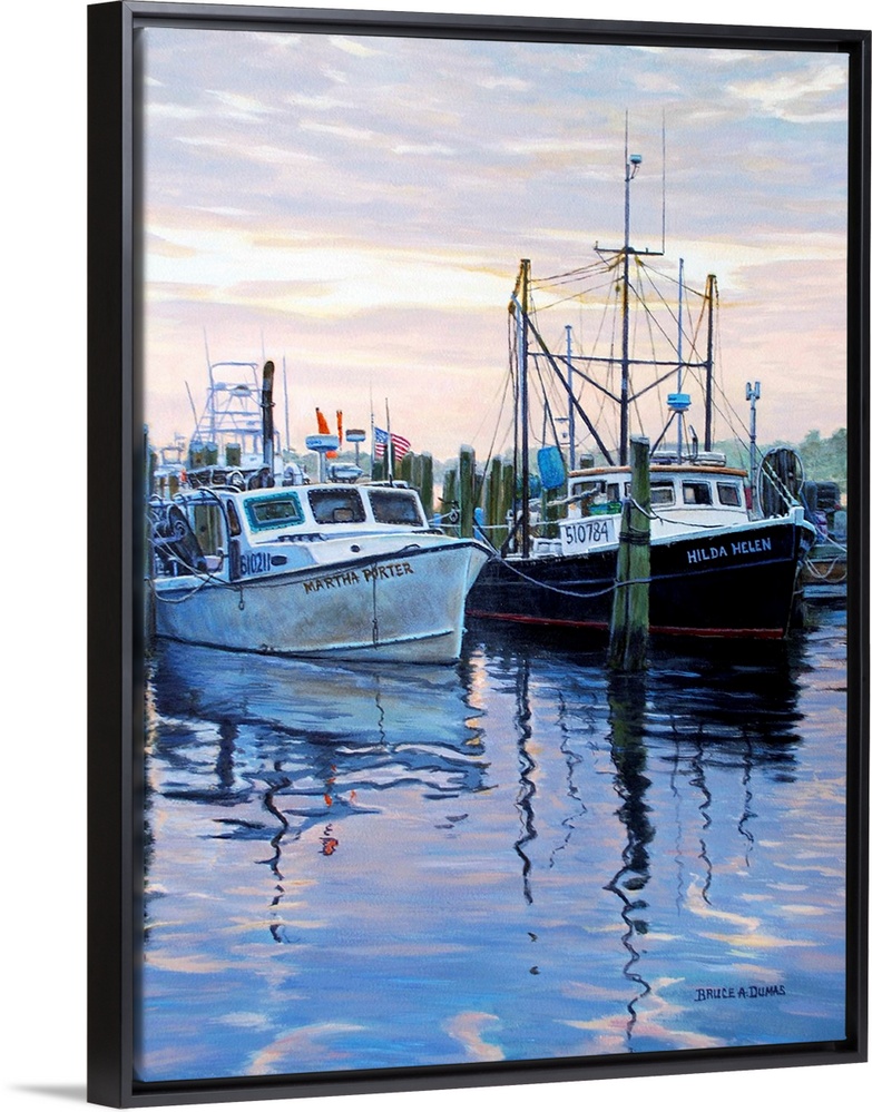 <p>Contemporary painting of two large boats docked to wooden pillars in the water in the early evening.</p>