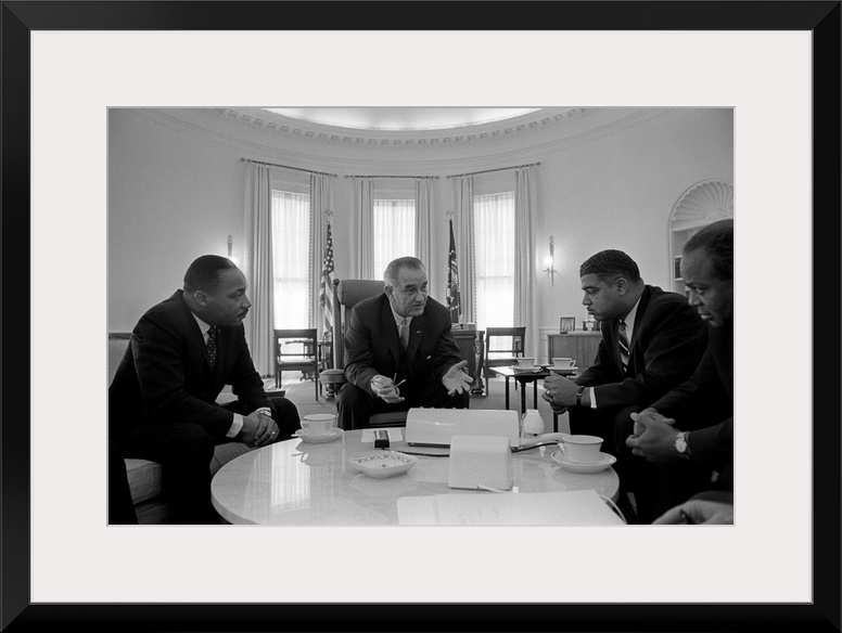 <p>MARTIN LUTHER KING, JR. (1929-1968). American clergyman and civil rights leader. In a meeting with President Lyndon B. Johnson, Whitney Young, and James Farmer at the White House in Washington, D.C. Photograph by Yoichi Okamoto, 18 January 1964.</p>