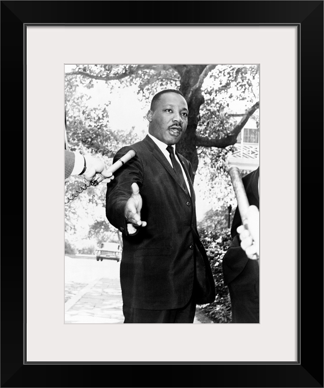 <p>MARTIN LUTHER KING, JR. (1929-1968). American clergyman and civil rights leader. Giving a press conference at Gracie Mansion in New York City. Photographed by Dick DeMarsico, July 1964.</p>