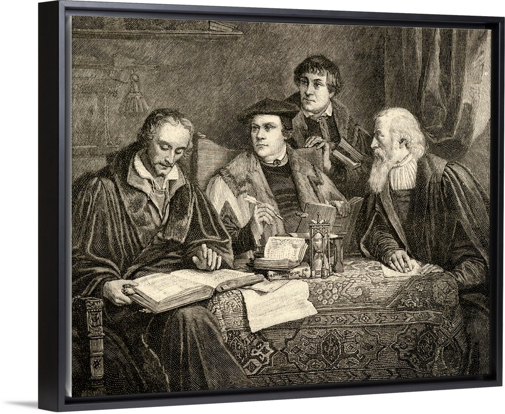 <p>Martin Luther, 1483-1546, German Theologian And Religious Reformer. Philipp Melancthon, 1497-1560, German Author, Humanist Reformer, Theologian And Educator. Johann Bugenhagen, 1485-1558, German Protestant Reformer, Sometimes Called Dr. Pomeranus. Caspar Cruciger 1504-1548, Theologian, Translating The Bible. From The Painting By P A Labouchere.</p>