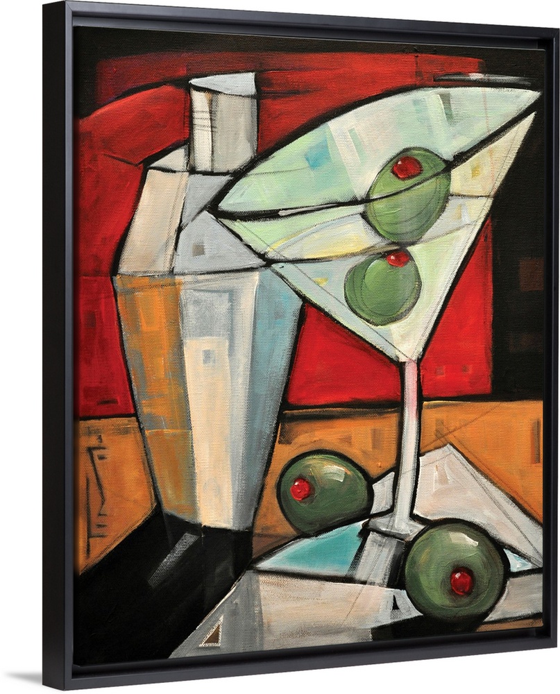 <p>Large, portrait, contemporary painting of a martini in a glass with two olives in it and two olives sitting at the base of the glass, a shaker sits behind the glass. Painted in a cubist style.</p>