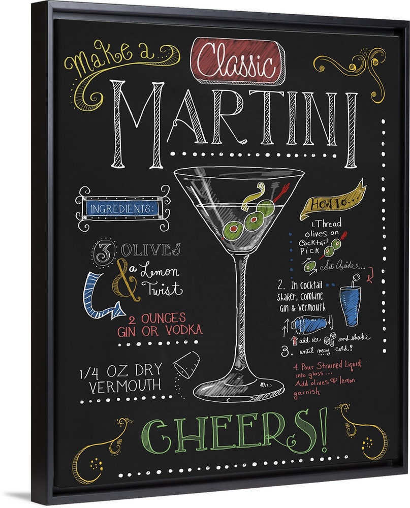 <p>Chalkboard-style sign with instructions and ingredients for making a martini.</p>