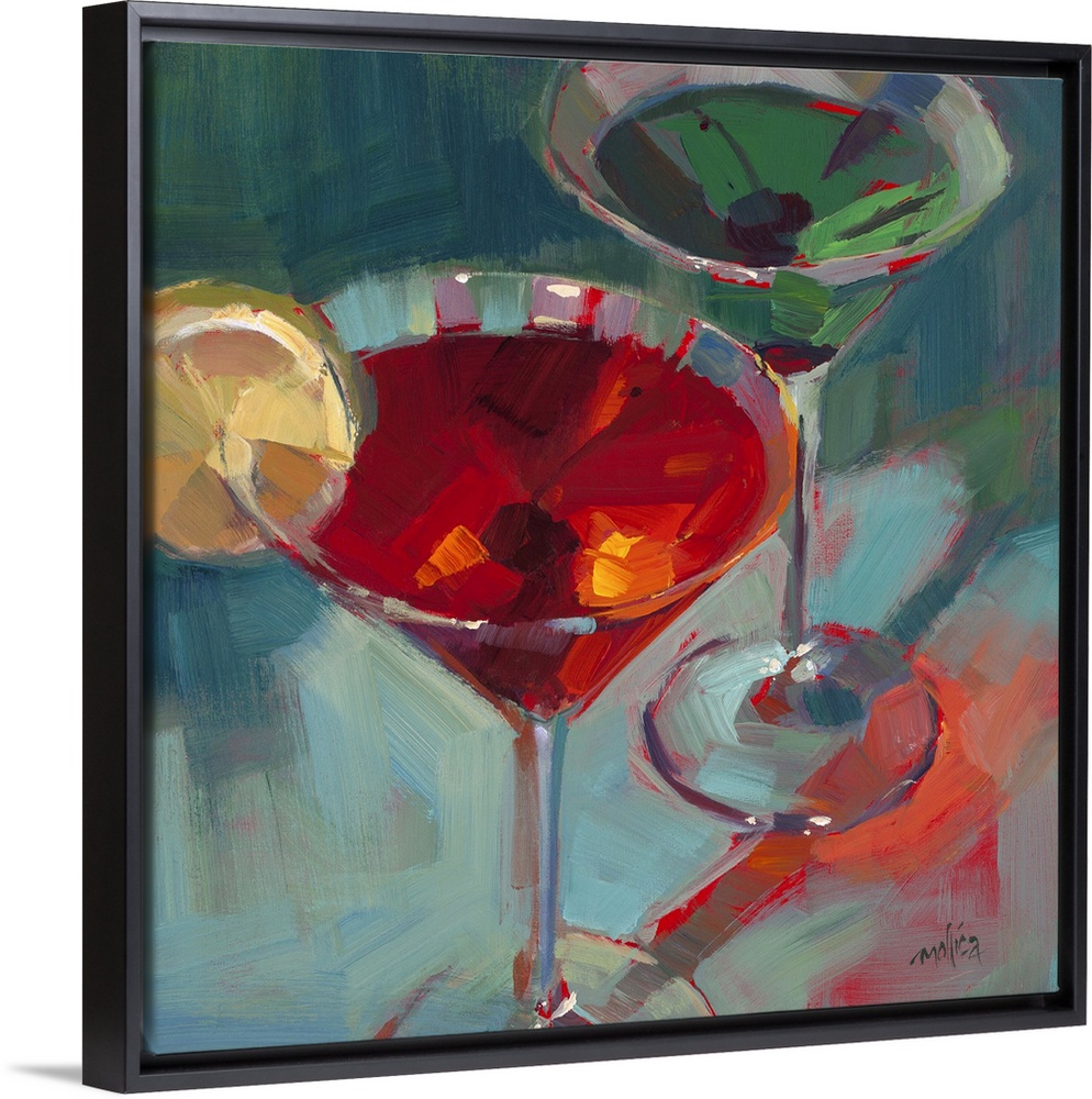 <p>Contemporary painting of colorful cocktails against a dark blue background.</p>