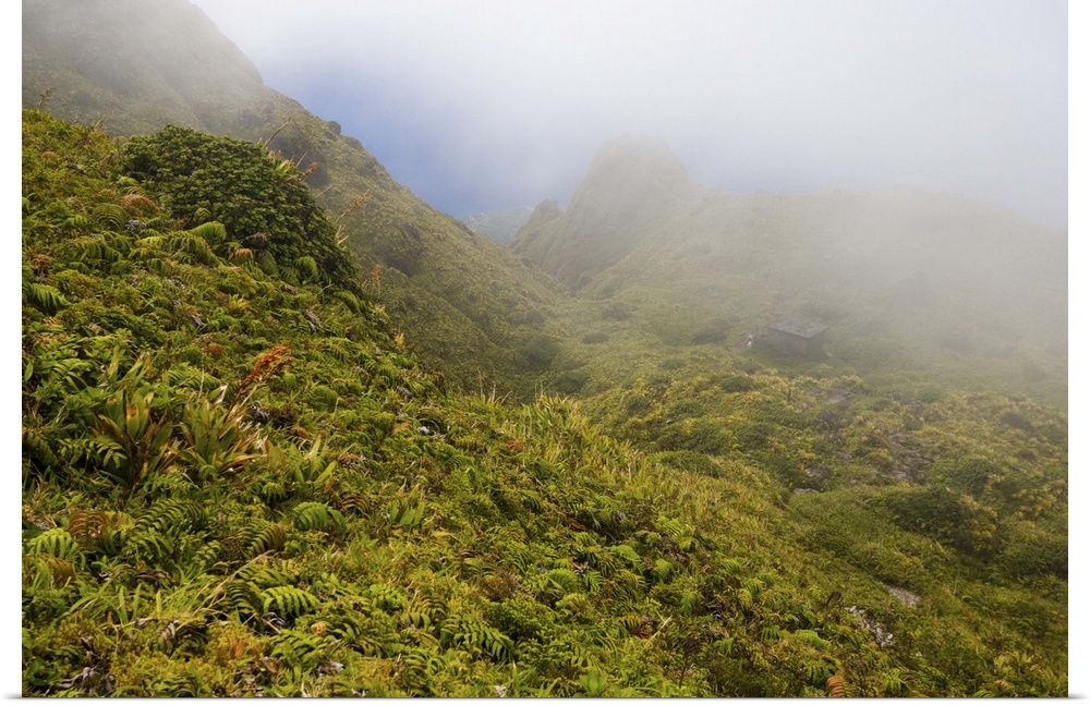 <p>MARTINIQUE. French Antilles. West Indies. Fog blows across sopes near summit of Mt. Pel..e. Low-growing lush tropical vegetation covers volcanic rock from 1926 eruption. Emergency shelter for hikers is visible through fog.</p>