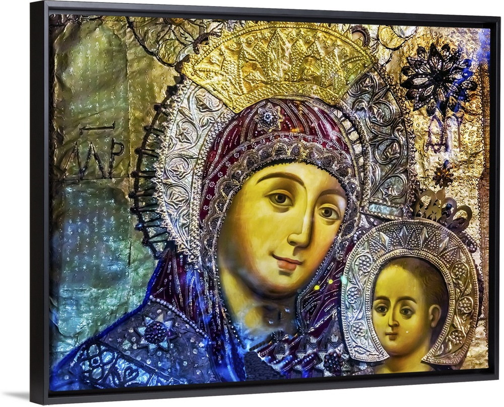 <p>Mary Jesus Icon Greek Orthodox Church of the Nativity Altar Nave Bethlehem West Bank Palestine. Chruch located above cave/grotto where Jesus was born. Location of Jesus birth in writings in 160AD, church built in 326AD by Constantine</p>
