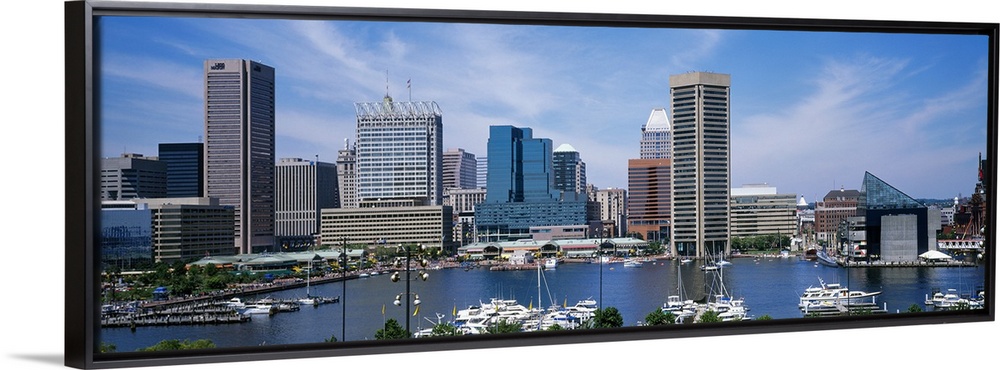 <p>Panoramic photograph showcases the skyline of a large city within the Northeastern United States on a sunny day. Towards the foreground of this picture, the skyscrapers and other buildings sit next to a large waterway filled with docks and an abundant amount of boats.</p>