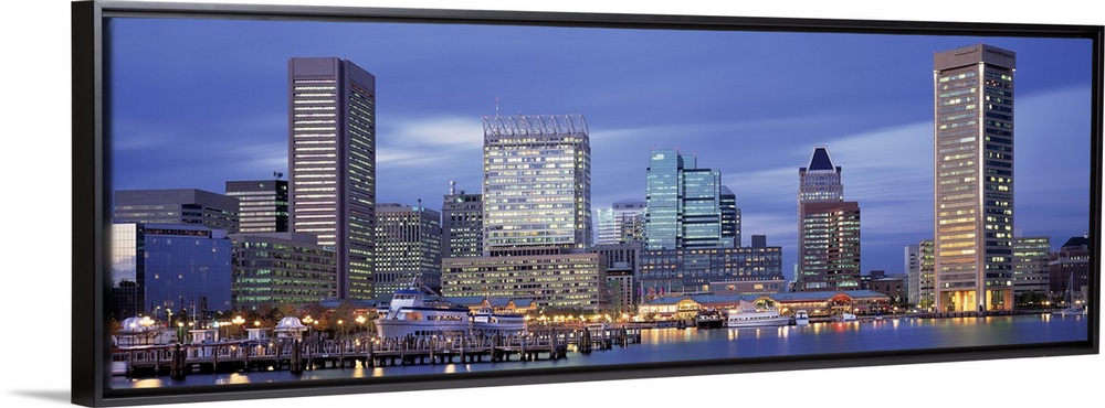 <p>This large panoramic photograph is of the Baltimore skyline at dusk with cool colors and the bulidings lit up.</p>