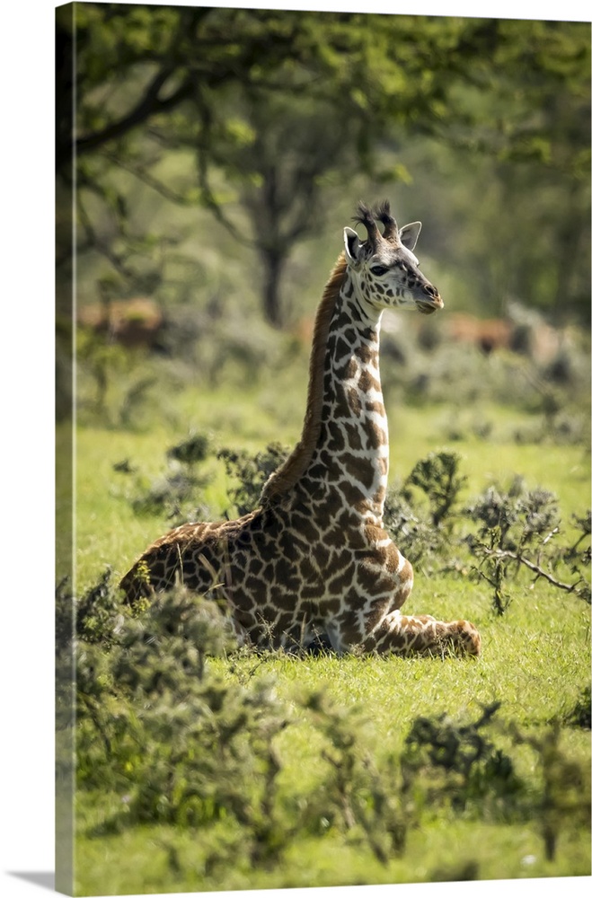 <p>Masai giraffe (giraffa camelopardalis tippelskirchii) kneeling in grass among bushes, Serengeti national park, Tanzania.</p>