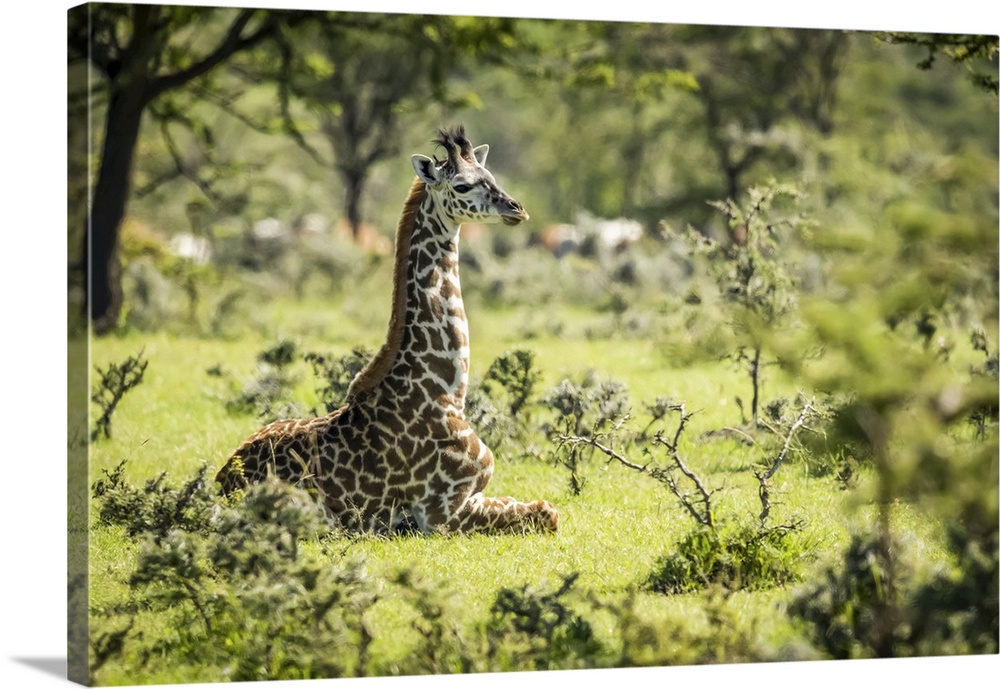<p>Masai giraffe (giraffa camelopardalis tippelskirchii) kneeling in grass among bushes, Serengeti national park, Tanzania.</p>