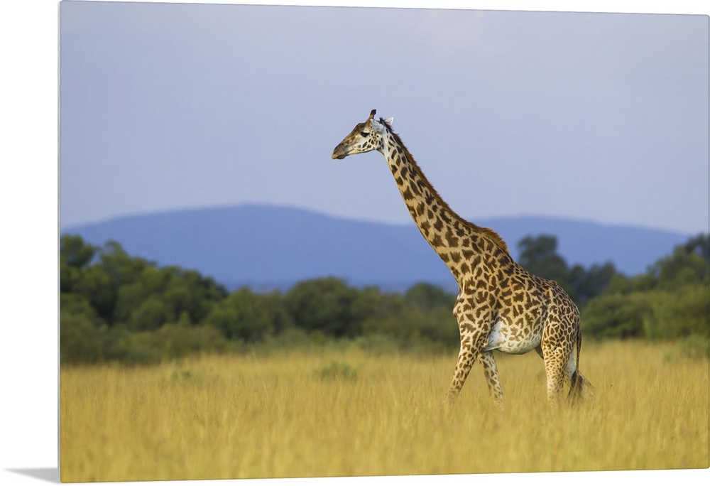 <p>Masai giraffe (Giraffa camelopardalis tippelskirchi), female adult walking in savanna, Maasai Mara National Reserve, Kenya, Africa.</p>