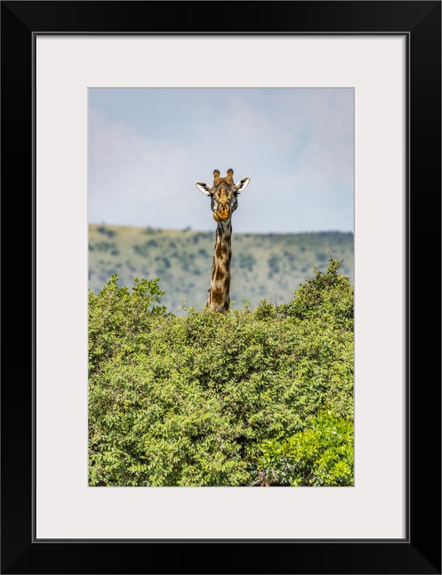 <p>Masai giraffe (Giraffa camelopardalis tippelskirchii) peeks over bushes in savannah, Serengeti National Park; Tanzania</p>
