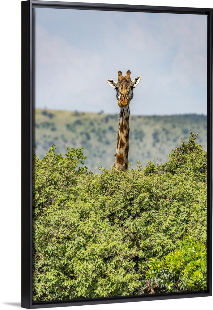 <p>Masai giraffe (Giraffa camelopardalis tippelskirchii) peeks over bushes in savannah, Serengeti National Park; Tanzania</p>
