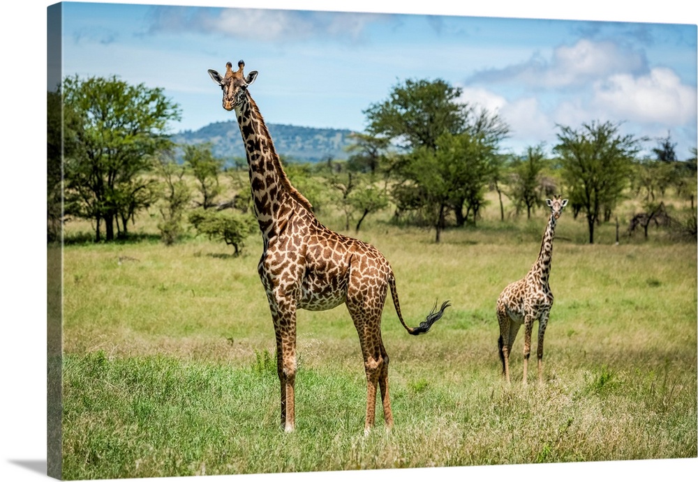 <p>Masai giraffe (giraffa camelopardalis tippelskirchii) stands with calf in savannah, Klein's camp, Serengeti national park, Tanzania.</p>