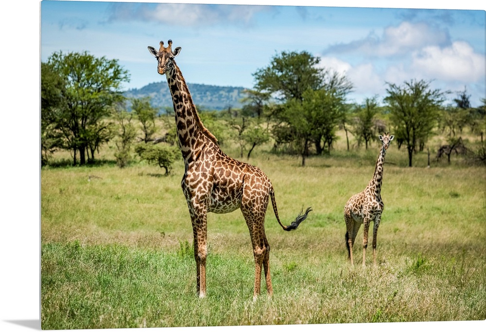 <p>Masai giraffe (giraffa camelopardalis tippelskirchii) stands with calf in savannah, Klein's camp, Serengeti national park, Tanzania.</p>