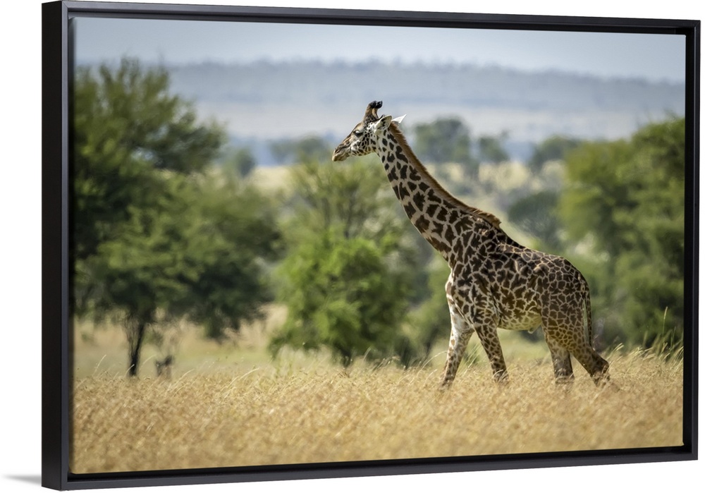 <p>Masai giraffe (giraffa camelopardalis tippelskirchii) walking through grass by trees, Serengeti national park, Tanzania.</p>