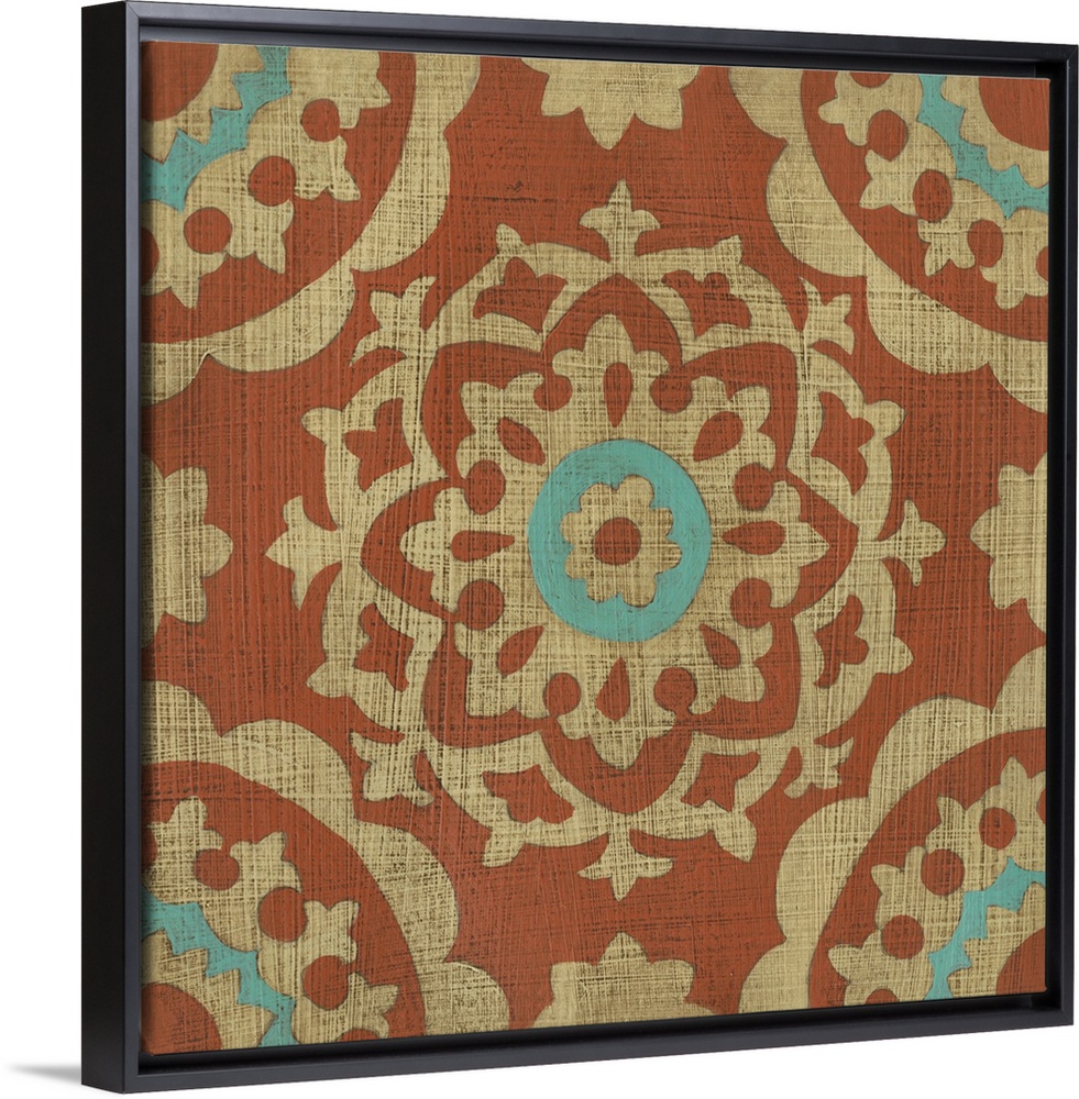 <p>Kaleidoscope patterns in earthy oranges and bright blues fill a cross hatched background resembling burlap material.</p>