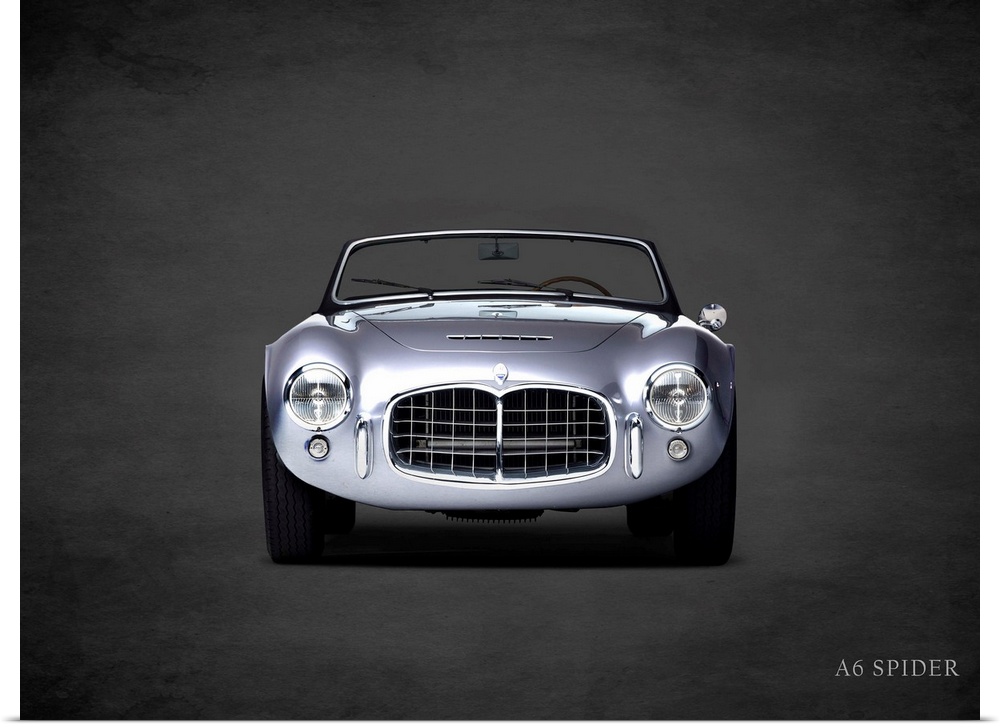<p>Photograph of a silver Maserati A6 Spider printed on a black background with a dark vignette.</p>