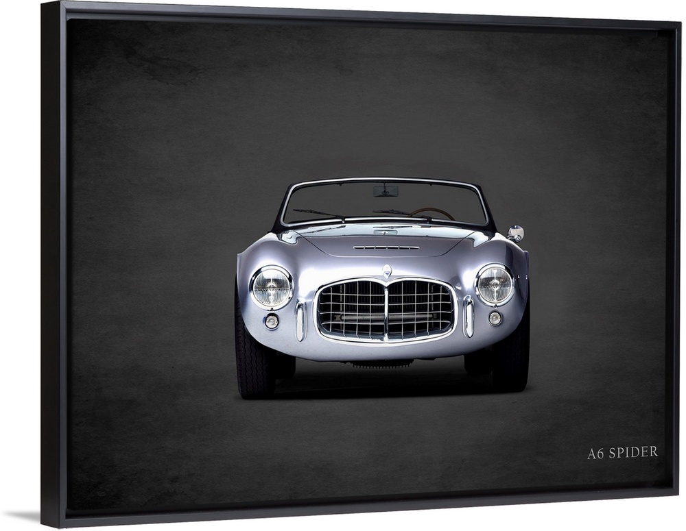 <p>Photograph of a silver Maserati A6 Spider printed on a black background with a dark vignette.</p>