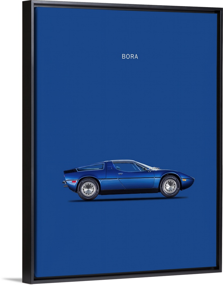 <p>Photograph of a blue Maserati Bora 1973 printed on a blue background</p>