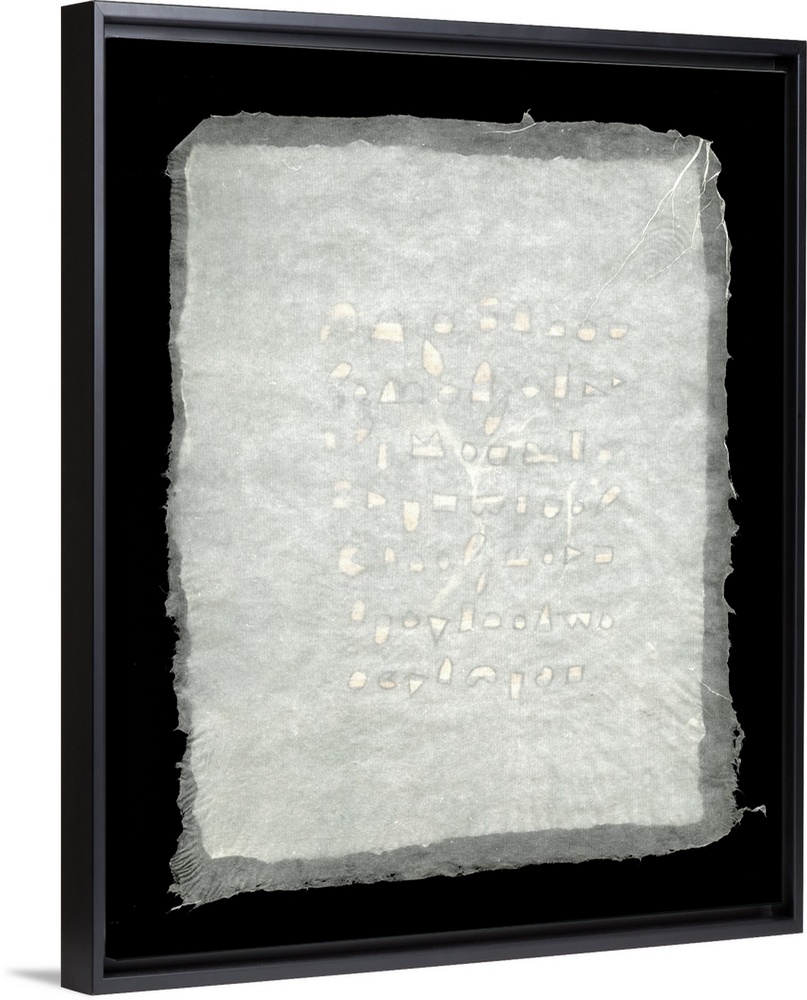 <p>Geometric shapes resembling text are partially obscured by a piece of translucent handmade paper.</p>