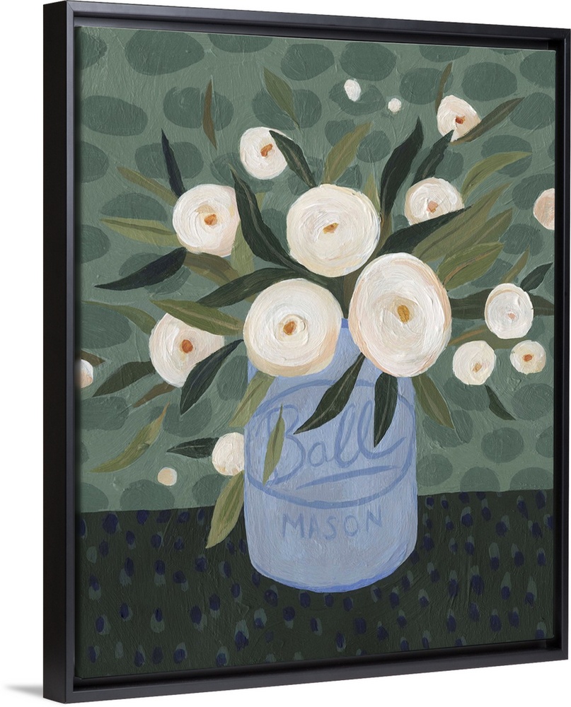 <p>Contemporary painting of a blue mason jar full of white flowers on a green toned backdrop with spots.</p>