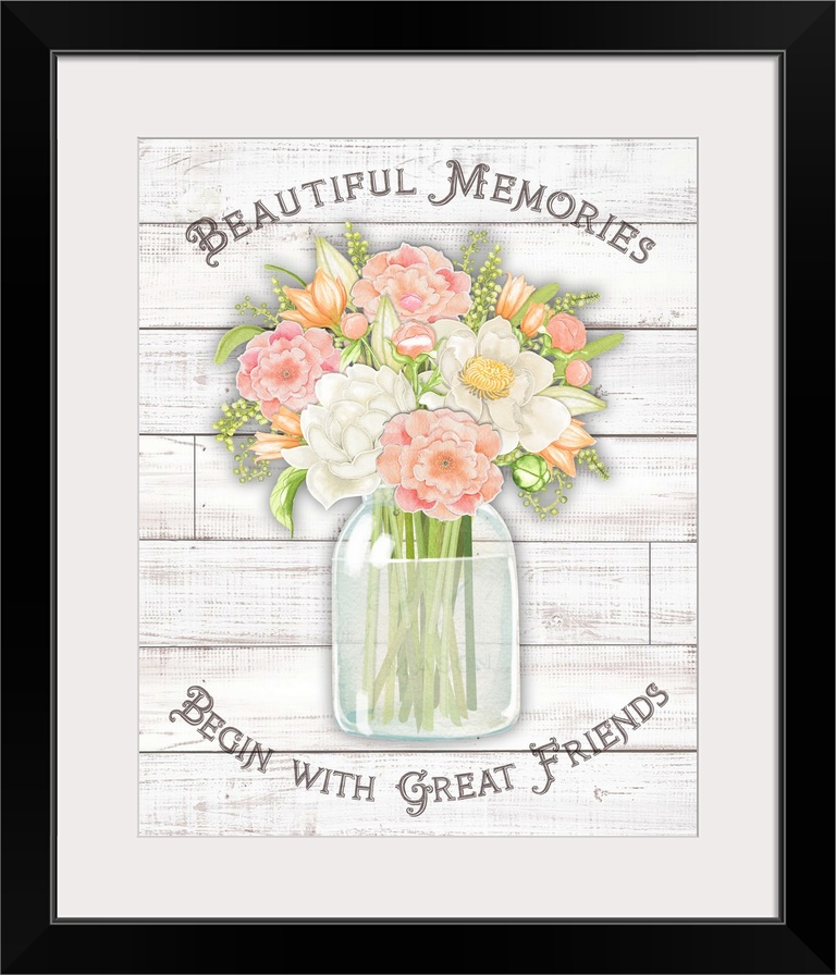 <p>Mason jar with flowers on wood planking are anchored with a touching sentiment, "Beautiful Memories Begin With Great Friends"</p>
