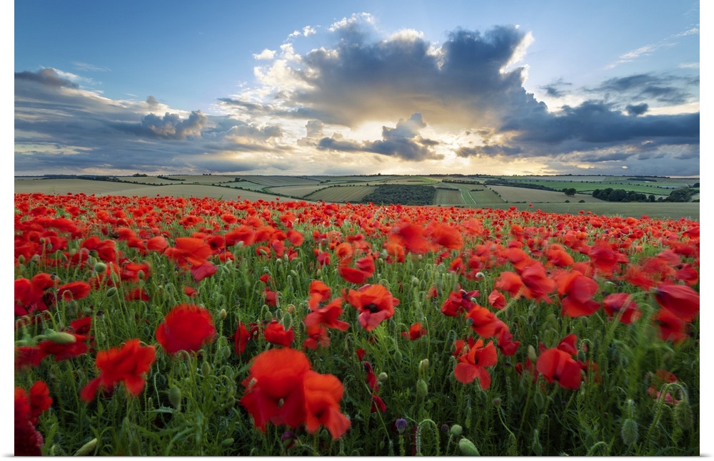 <p>Mass of red poppies growing in field in Lambourn Valley at sunset, East Garston, West Berkshire, England, United Kingdom, Europe</p>