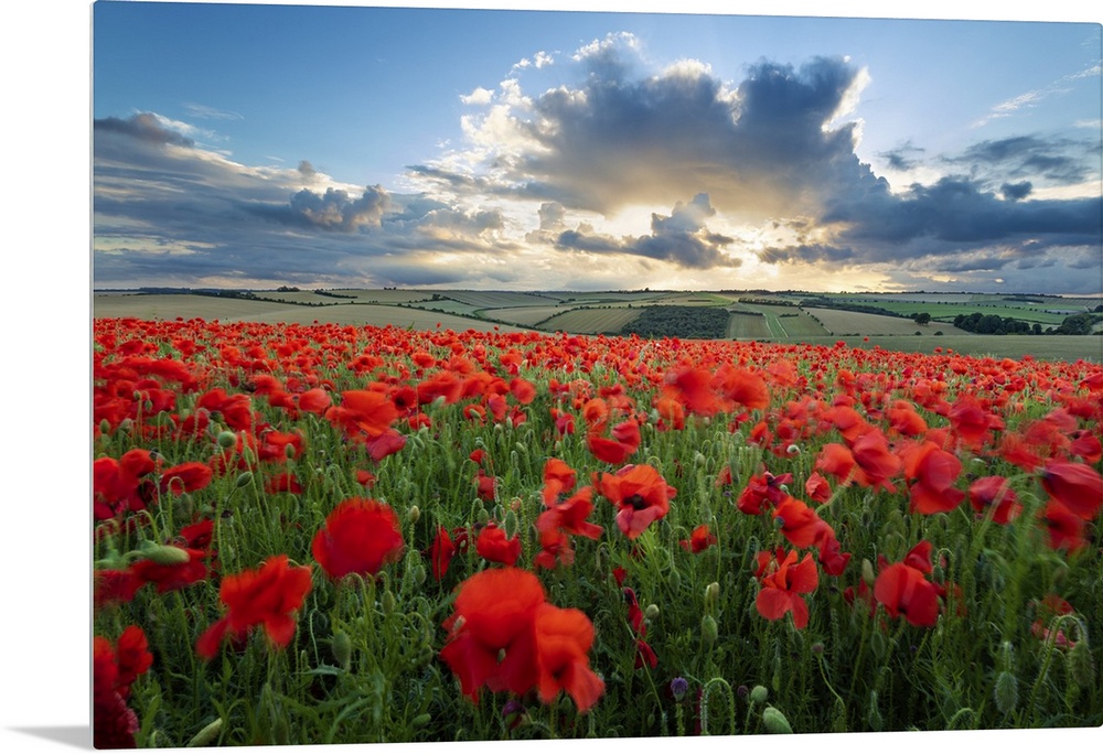 <p>Mass of red poppies growing in field in Lambourn Valley at sunset, East Garston, West Berkshire, England, United Kingdom, Europe</p>
