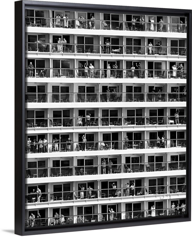 <p>Several people sunning on balconies of a hotel in the summer.</p>