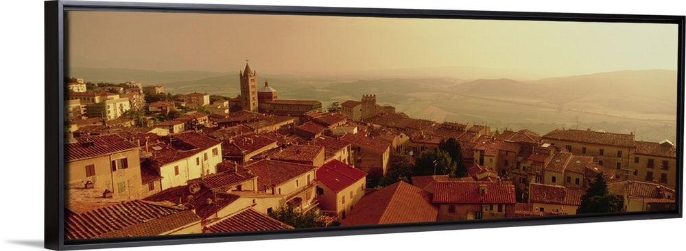 <p>Decorative artwork perfect for the home that is a panoramic photograph taken of a town in Italy as the sun sets off in the distance and shines upon the rooftops.</p>