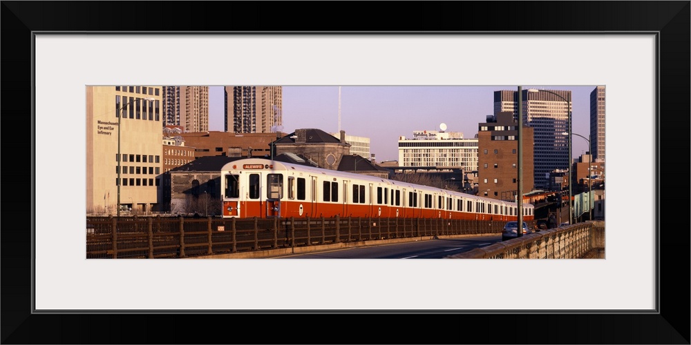<p>An above ground subway train is photographed in panoramic view with the Boston skyline shown in the background.</p>