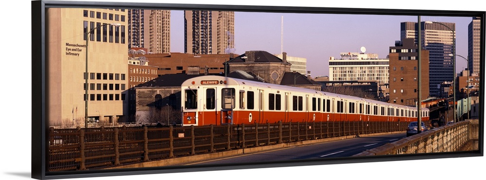 <p>An above ground subway train is photographed in panoramic view with the Boston skyline shown in the background.</p>