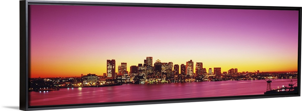 <p>Big, wide angle photograph of a distant Boston skyline, with lit skyscrapers at sunset.</p>