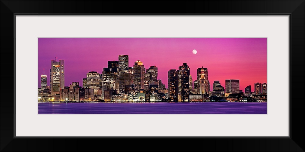 <p>Panoramic photograph of a skyline in Boston, Massachusetts at night by the shore. The moon in the background towers above the skyscrapers.</p>