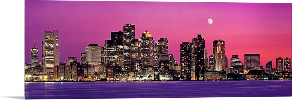 <p>Panoramic photograph of a skyline in Boston, Massachusetts at night by the shore. The moon in the background towers above the skyscrapers.</p>