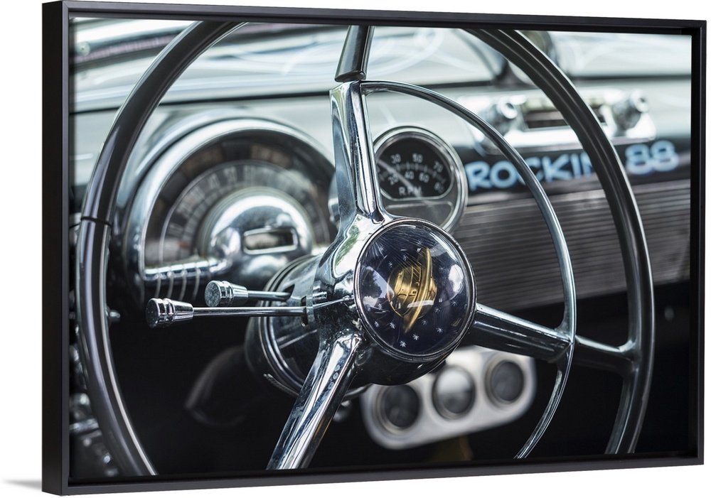 <p>Massachusetts, Cape Ann, Gloucester, Antique Car, Early 1960's-Era Antique Car Interior</p>