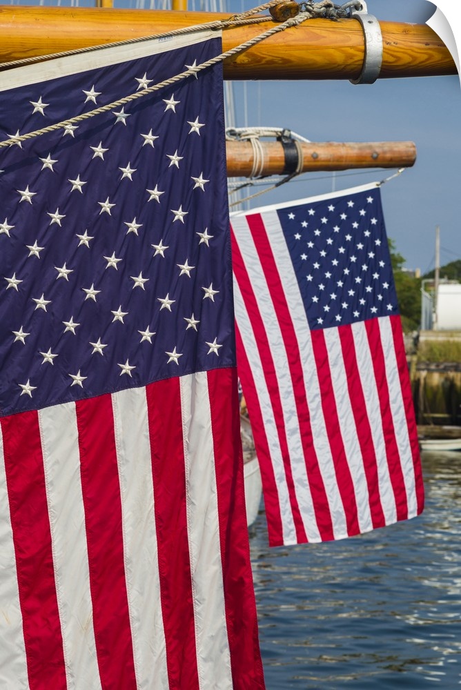 <p>USA, Massachusetts, Cape Ann, Gloucester, America's Oldest Seaport, Annual Schooner Festival, US flag</p>