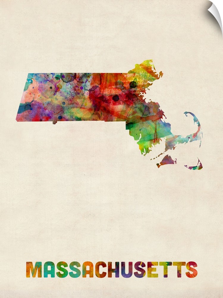 <p>Contemporary piece of artwork of a map of Massachusetts made up of watercolor splashes.</p>