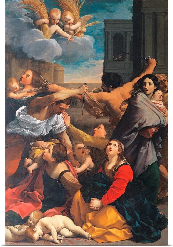 <p>Massacre of the Innocents, by Guido Reni, 1611 about, 17th Century, oil on canvas, cm 268 x 170 - Italy, Emilia Romagna, Bologna, National Art Gallery, inv. 439. All. Drama. Young women crying while getting pushed around or fleeing with children in their</p>