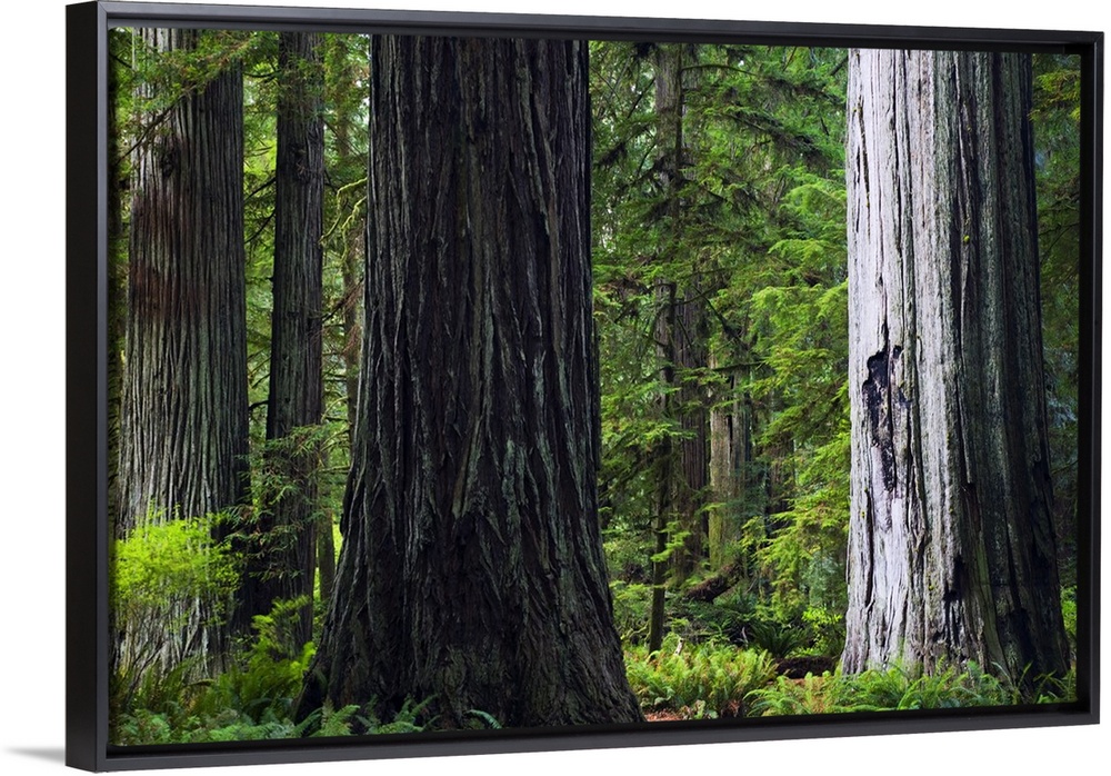 <p>Big, landscape photograph of giant redwood tree trunks surrounded by green foliage in Prairie Creek Redwoods State Park, California.</p>
